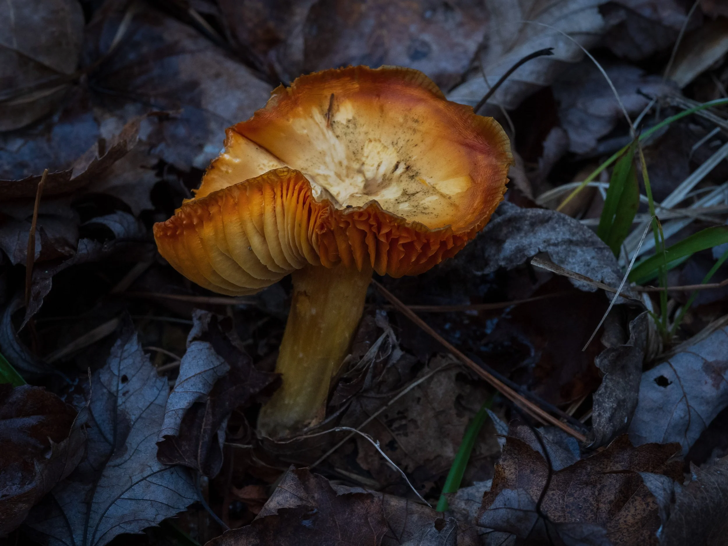 The mushrooms I saw—and there were not many—stood out like beacons, especially an orange one that looked like it was being lit by fire.