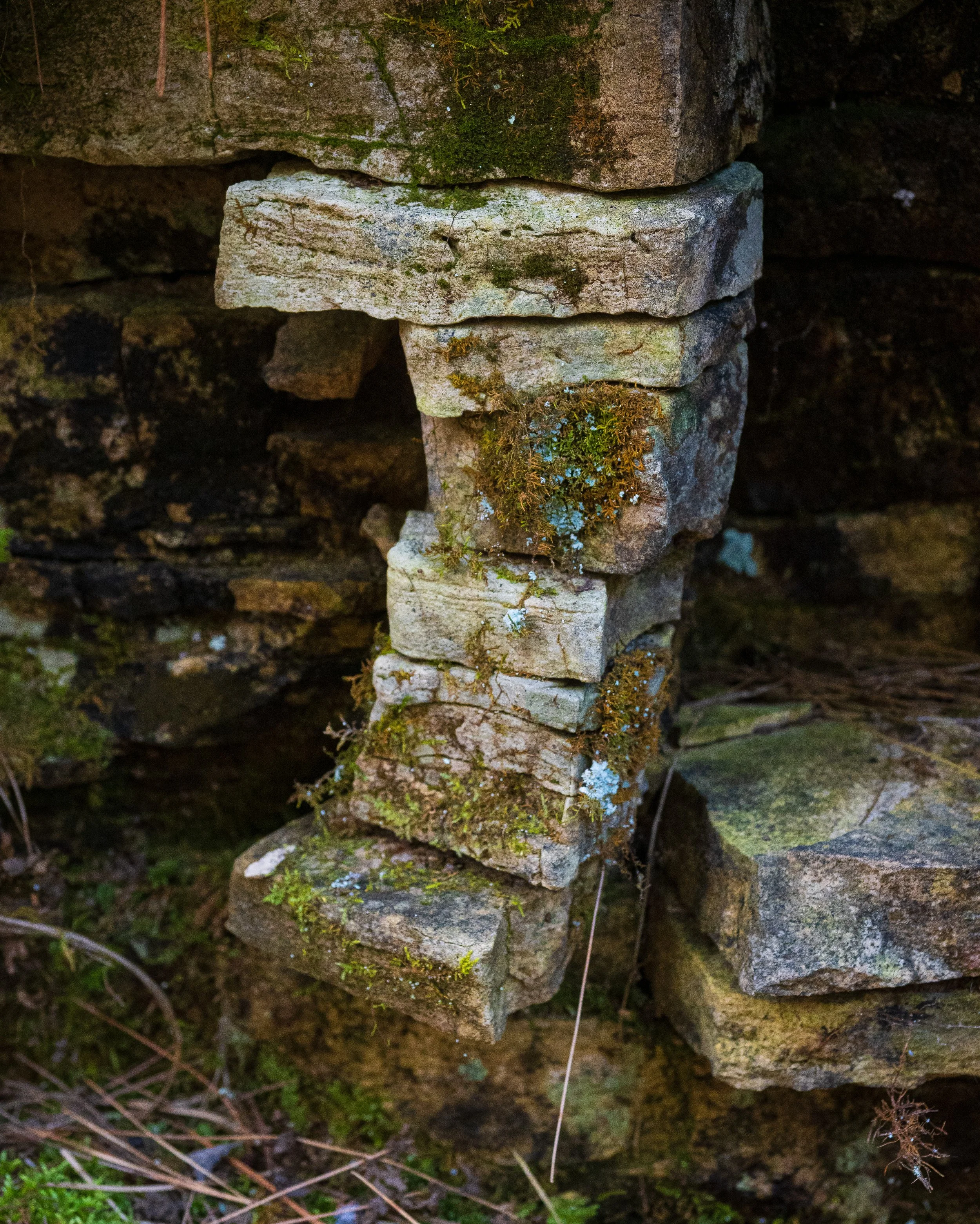 On Wisconsin Rustic Road 51, I saw an unusual rock formation; part of a cliff that rose from the edge of the dirt road. It was a tower formed from layers of sedimentary rock, probably sandstone or limestone. It was balanced precariously and will eventually topple. The shallow cave that surrounds it was formed when water eroded the rock layers around it, leaving it still standing. Each block in the tower is the remnant of a layer in the bedrock.